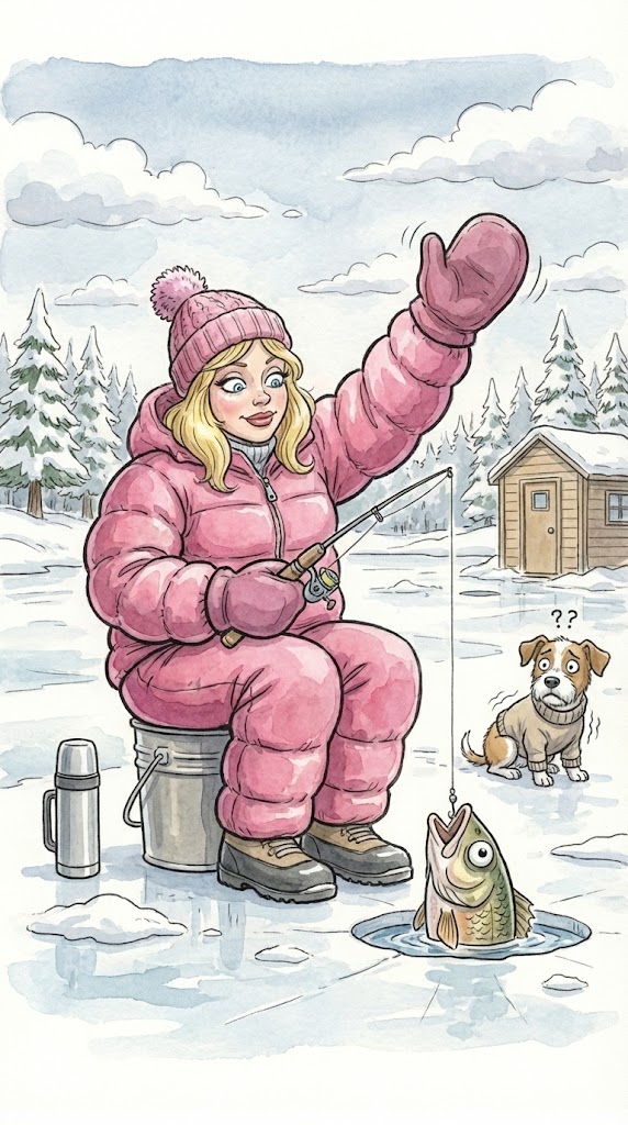 A woman with a new fishing rod decided to go ice fishing the day after receiving it as a gift. She gathered her gear early in the morning and went out onto the ice.