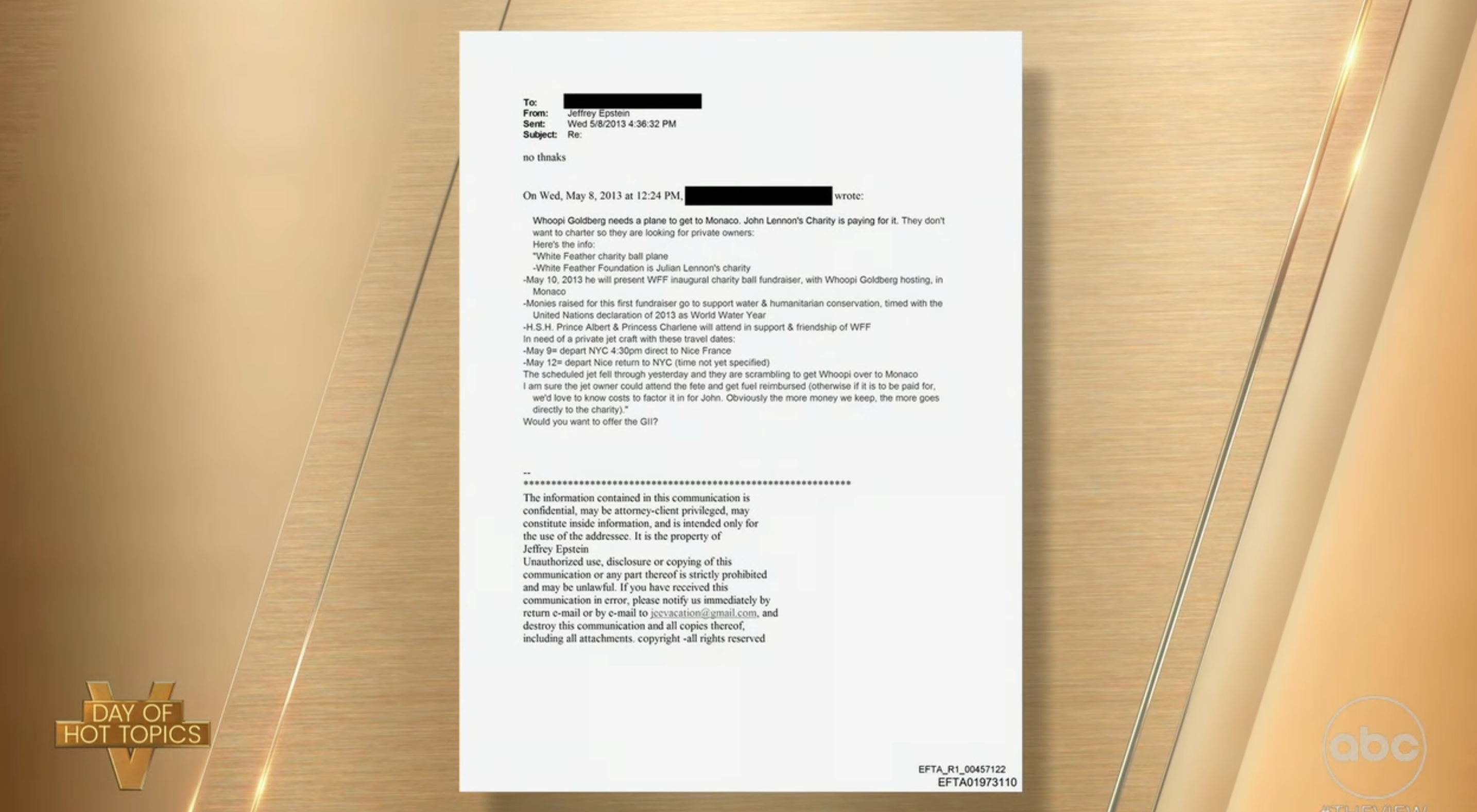 The actress explained that while her name appeared in the files, it was because she needed a plane to attend a charity event in Monaco in 2013. The request was declined by Epstein, and Goldberg stated this is her only link.