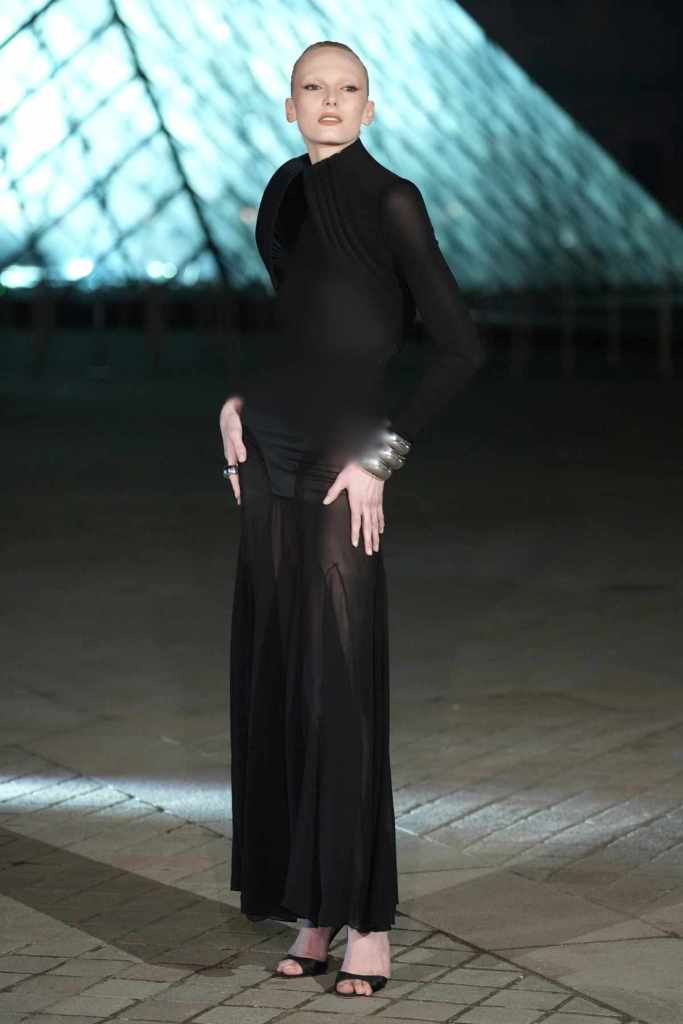 The design included undergarments beneath the mesh for a playful yet elegant style. Consani completed her look with metallic accessories, sleek hair, and polished makeup against the iconic Louvre backdrop.