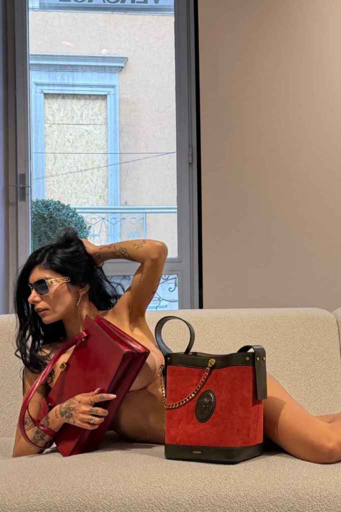 In the Instagram photos, Mia Khalifa posed on a cream-colored couch while using a bright red Versace handbag as her top, creating a striking contrast with the background. Her styling featured black peep-toe heels and oversized sunglasses.