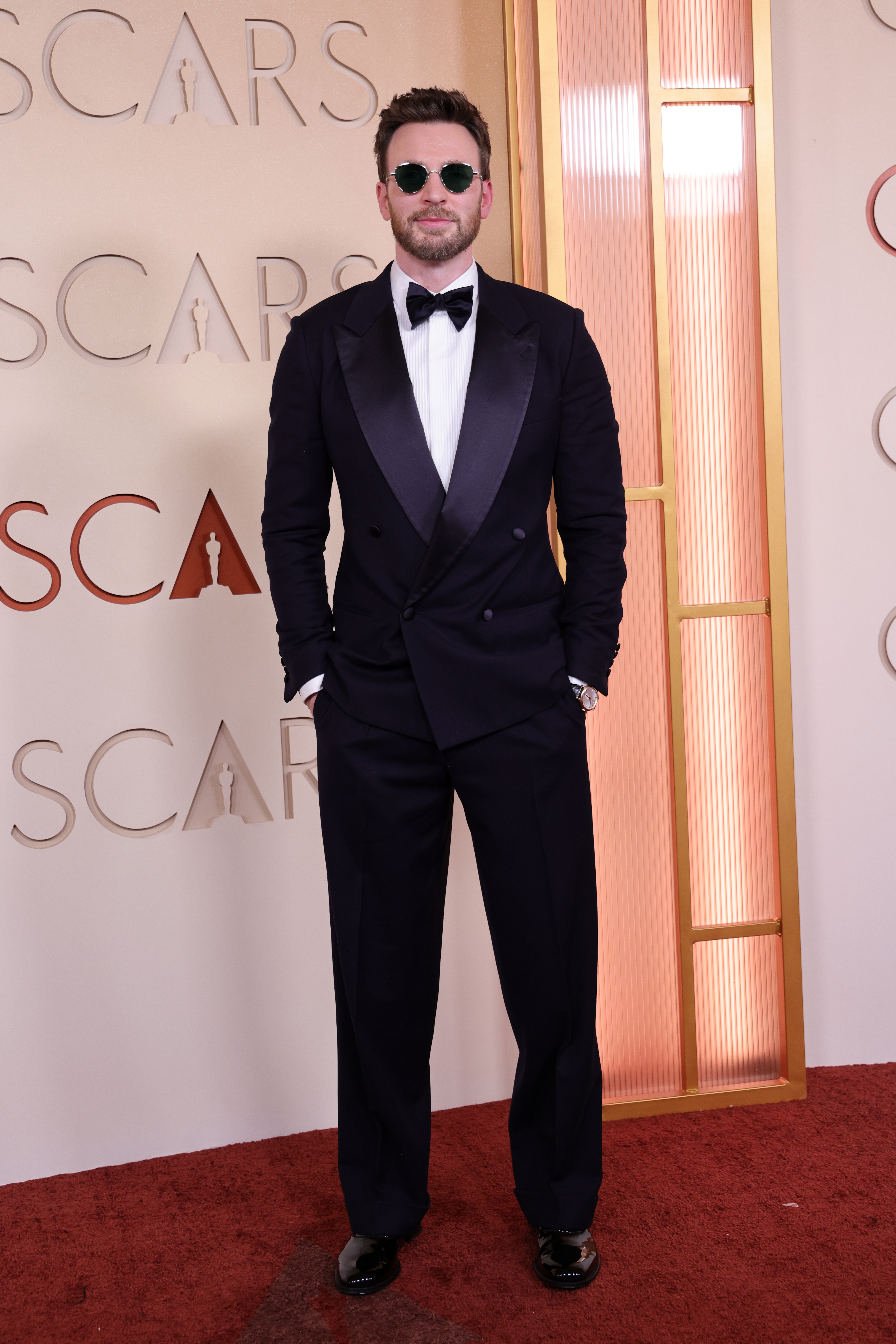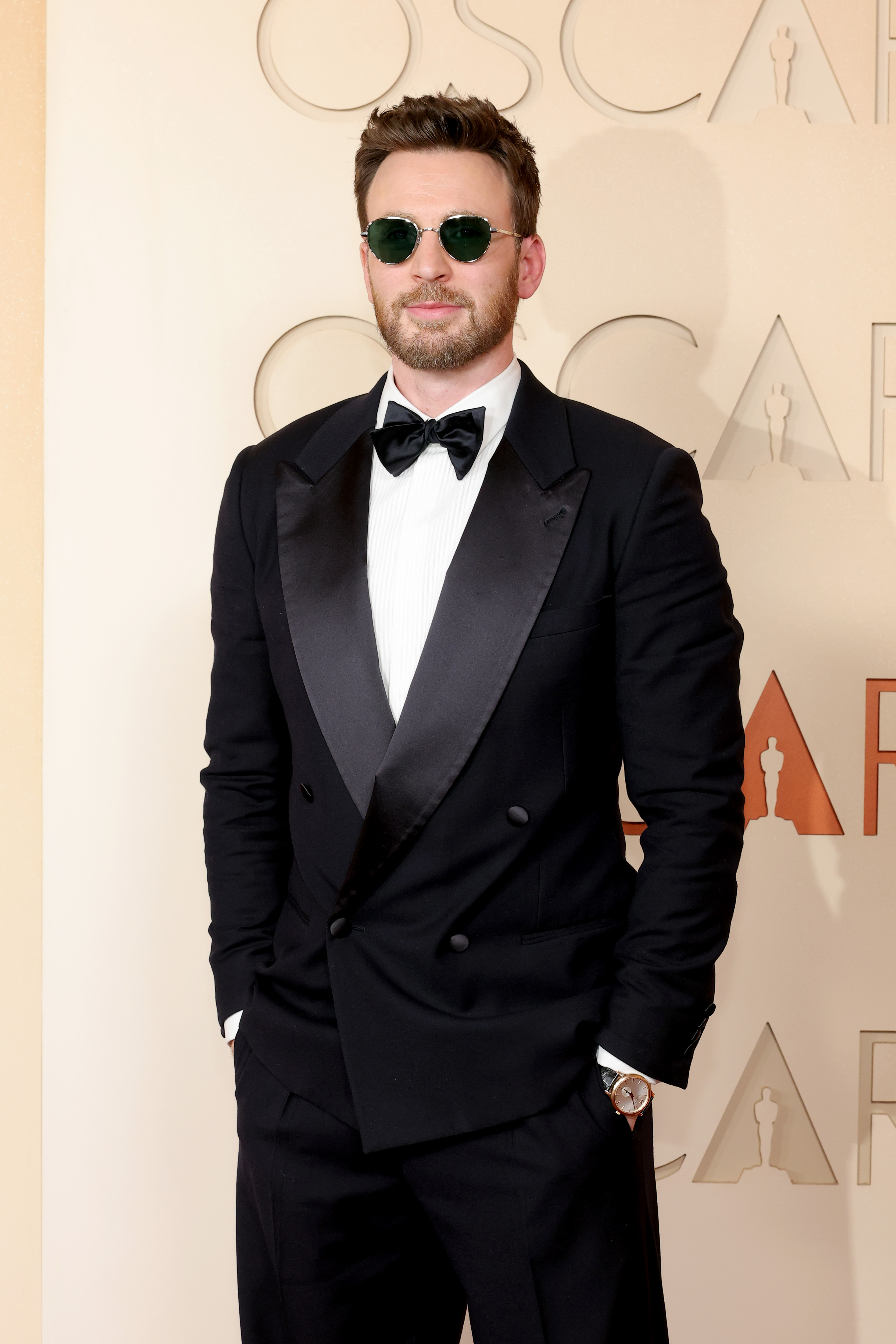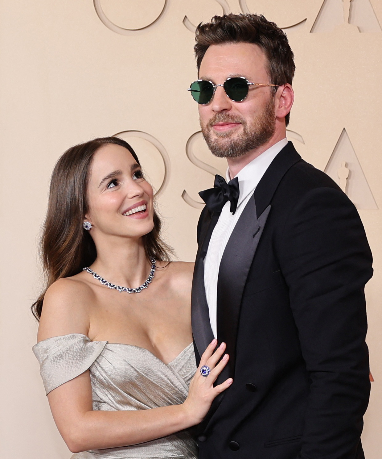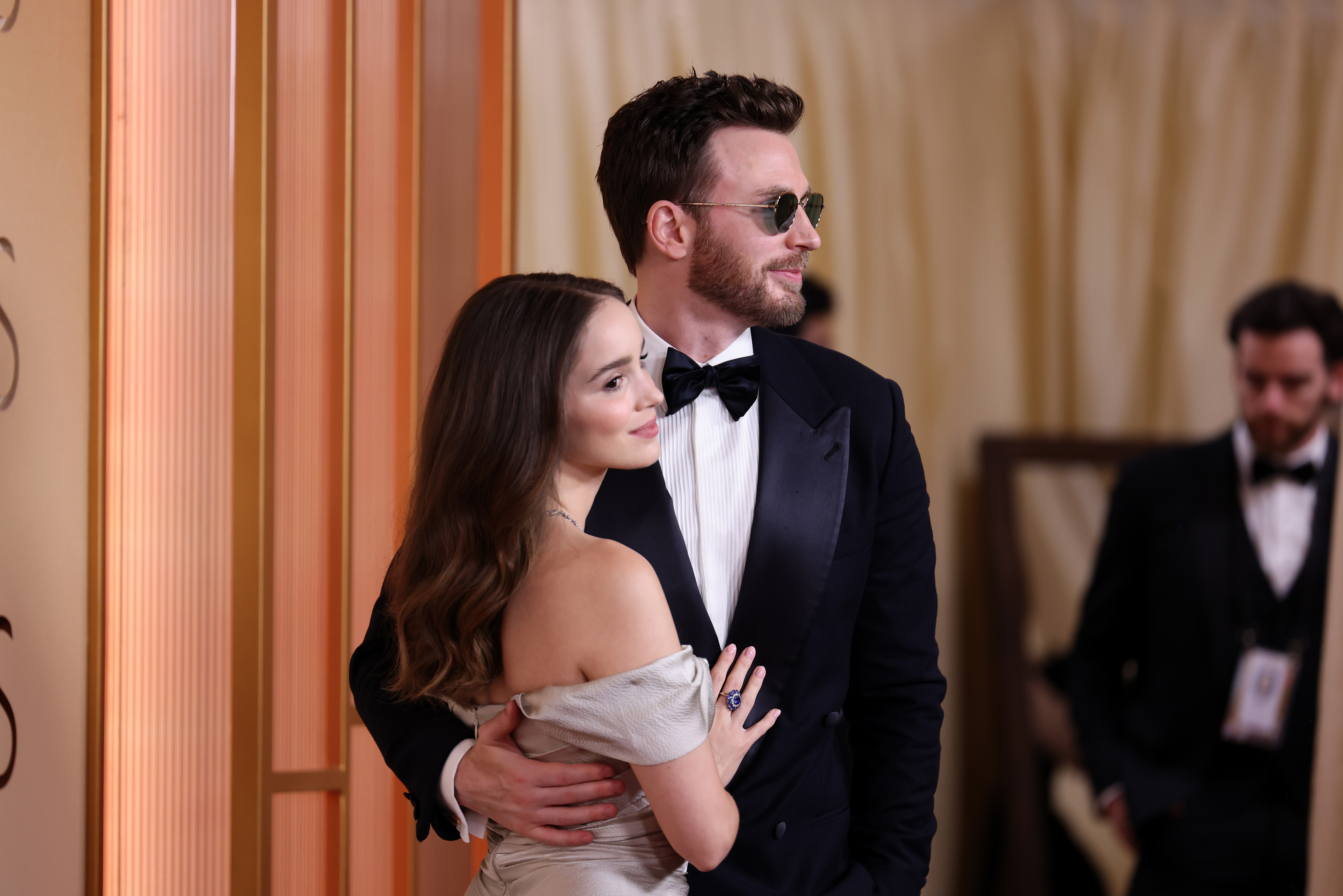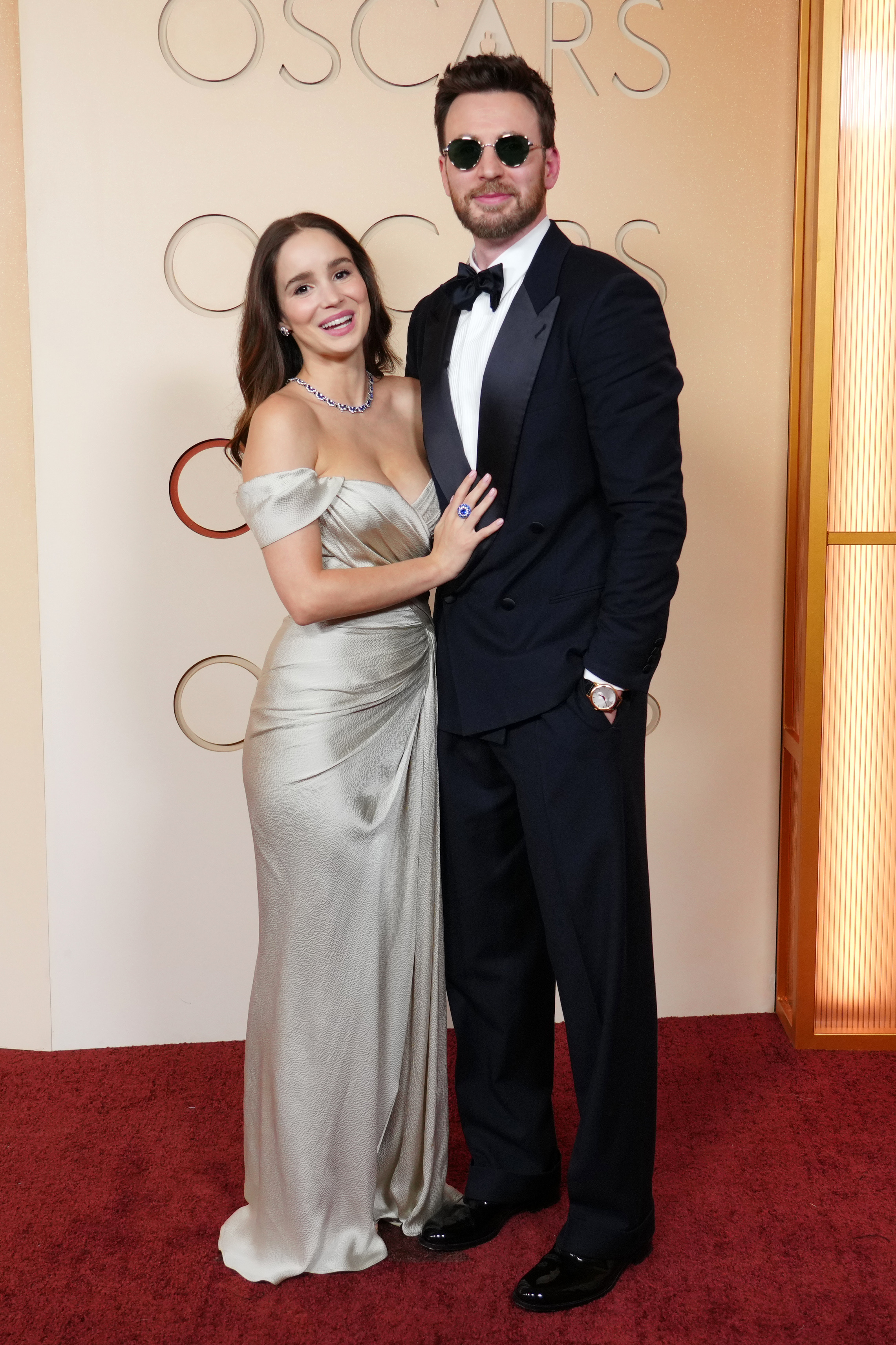 The couple attended their first Oscars together on Sunday. Chris Evans wore a black tuxedo with a white shirt and sunglasses, while Alba Baptista dazzled in a champagne gown with statement jewelry.