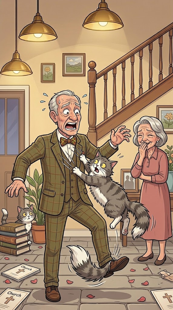 Upon entering, he angrily kicks the cat, which runs away after letting out a loud meow. The wife enters and asks about the situation, prompting him to blame the cat for his injuries.