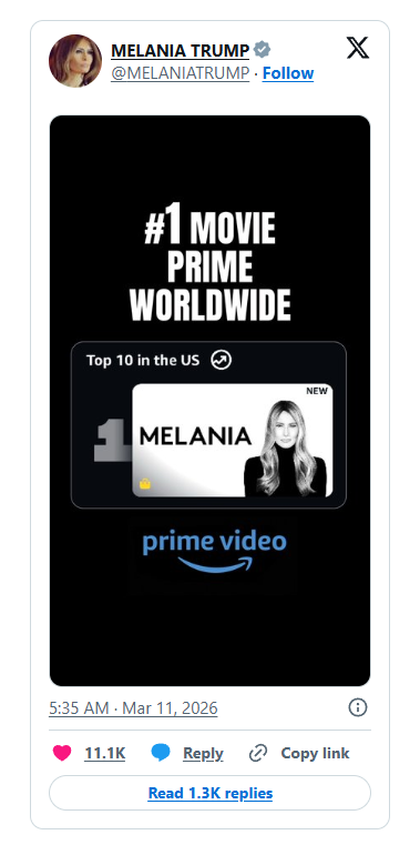 The documentary about Melania Trump, released on Prime Video on March 9, has sparked online debate after being announced as the top movie on the platform worldwide. It hit cinemas earlier this year, showcasing the lead-up to her husband Donald Trump's 2025 inauguration.