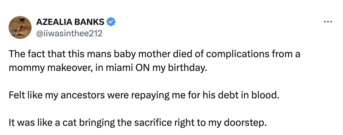 Banks, well-known for her song "Luxury," tweeted that the passing of D.C. Young Fly's partner on her birthday felt like a form of ancestral repayment. In a follow-up tweet, Banks described herself as "the pettiest."