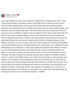 The post also included personal attacks, with Trump stating a preference for the pope’s brother due to his support for Trump's agenda and alleging strategic reasons for Leo's elevation by the Catholic Church.